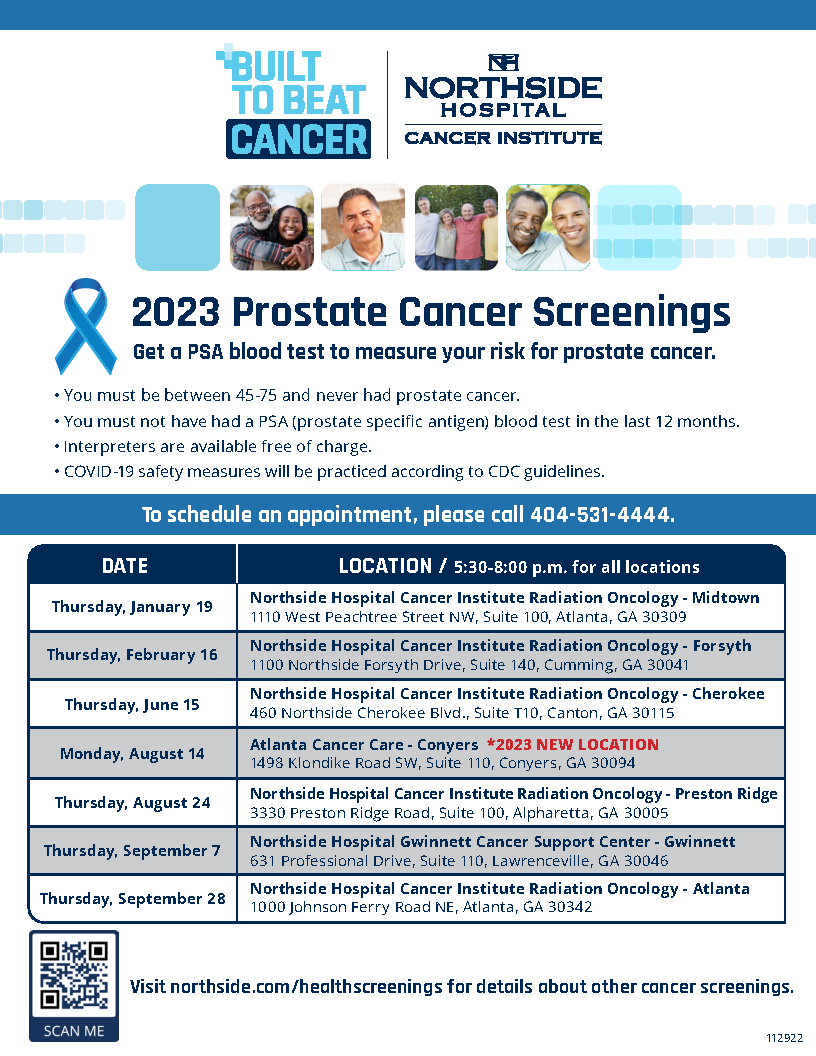 Prostate Cancer Screenings with Northside Cancer Institute Call 404-531-4444 to make an appointment for a free PSA blood test to measure your risk for prostate cancer. Requirements: • You must be between 45-75 and never had prostate cancer. • You must not have had a PSA (prostate specific antigen) blood test in the last 12 […]